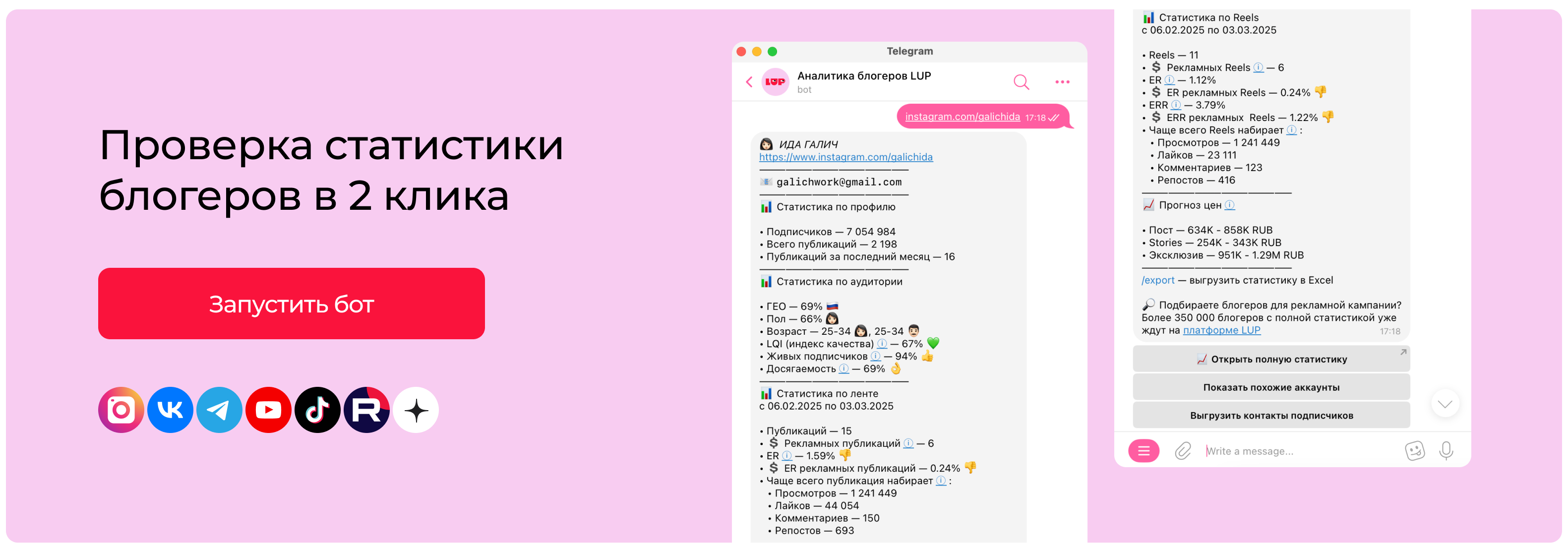 Перейдите в бот @labelup_bot и отправьте ссылку на аккаунт из Instagram*, VK, YouTube, Telegram, TikTok, RUTUBE или Дзен (или сразу список ссылок до 20-30 штук). В ответ придет отчёт со статистикой блогера.